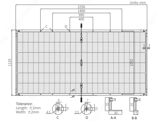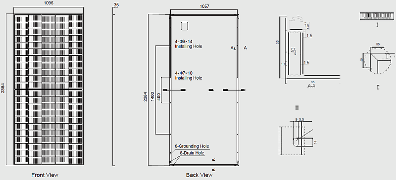 + Monokrystalické články 182x91mm, 144 PERC článků (6x 24) + Minimální objednávka: 620 kusů + Váha: 32,3kg + Rozměry: 2256x1133x35mm + Záruka na materiál: 12 let + Záruka na výkon: 30 let na 85 % úroveň + Čelní sklo: tvrzené sklo 3,2mm + Rám materiál: eloxovaná hliníková slitina + Rám barva: stříbrná nebo černá + Připojovací skříň: IP68, 3 Bypass Diody + Výstupní kabeláž: 2x 4.0mm², 600mm (+), 600mm (-) + Připojovací konektor: MC4 + Mechanická zátěž sněhem: max. 5400Pa + Mechanická zátěž větrem: max. 2400Pa + Teplotní koeficient Pmax: -0.34% / °C + Teplotní koeficient Voc: -0.265% / °C + Teplotní koeficient Isc: +0.050% / °C + Provozní teplota článku (NOCT): 45±2 °C + Provozní teplota: -45°C až +85°C + Maximální výkon (Pmax): 550W (STC) / 411W (NOCT) + Účinnost modulu (STC): 21,50 % + Maximální napájecí napětí (Vmp): 41,95V (STC) / 39,14V (NOCT) + Maximální proud (Imp): 13,12A (STC) / 10,51A (NOCT) + Proud nakrátko (Isc): 13,99A (STC) / 11,29A (NOCT) + Napětí naprázdno (Voc): 49,80A (STC) / 46,82V (NOCT) + Tolerance výkonu (W): (0,+5W) + Maximální napětí systému: 1500V + Maximální hodnota pojistky: 25A |