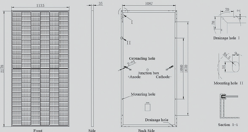 + Monokrystalické články 182x91mm, 144 PERC článků (6x 24) + Minimální objednávka: 62 kusů + Váha: 28kg + Rozměry: 2279x1133x35mm + Záruka na materiál: 12 let + Záruka na výkon: 25 let na 84,8 % úroveň + Čelní sklo: tvrzené sklo 3,2mm + Rám materiál: eloxovaná hliníková slitina + Rám barva: stříbrná nebo černá + Připojovací skříň: IP68, 3 Bypass Diody + Výstupní kabeláž: 2x 4.0mm², 600mm (+), 600mm (-) + Připojovací konektor: MC4 + Mechanická zátěž sněhem: max. 5400Pa + Mechanická zátěž větrem: max. 2400Pa + Teplotní koeficient Pmax: -0.35% / °C + Teplotní koeficient Voc: -0.275% / °C + Teplotní koeficient Isc: +0.045% / °C + Provozní teplota článku (NOCT): 45±2 °C + Provozní teplota: -45°C až +85°C + Maximální výkon (Pmax): 560W (STC) / 423W (NOCT) + Účinnost modulu (STC): 21,70 % + Maximální napájecí napětí (Vmp): 42,88V (STC) / 40,50V (NOCT) + Maximální proud (Imp): 13,06A (STC) / 10,45A (NOCT) + Proud nakrátko (Isc): 13,83A (STC) / 11,06A (NOCT) + Napětí naprázdno (Voc): 51,91A (STC) / 48,20V (NOCT) + Tolerance výkonu (W): (0,+5W) + Maximální napětí systému: 1500V + Maximální hodnota pojistky: 25A |